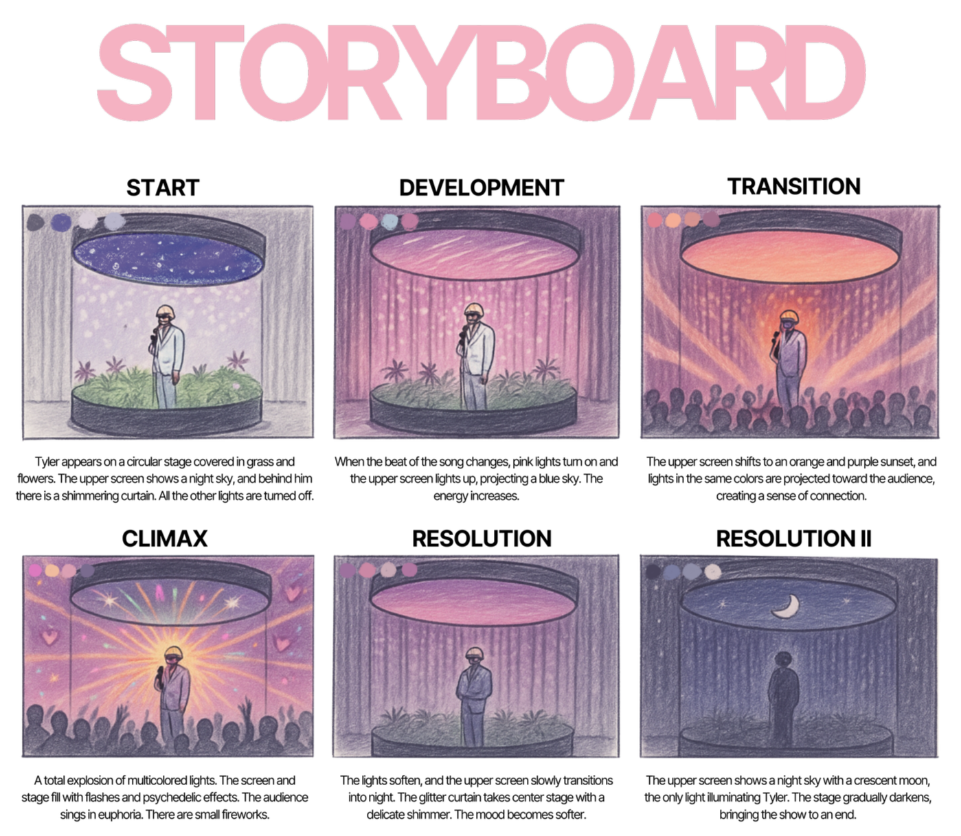 The storyboard illustrates the visual and emotional progression of project showing how lighting, projections, and atmosphere evolve with the music. Its purpose is to communicate the narrative flow of the show and how design elements create an immersive live experience.