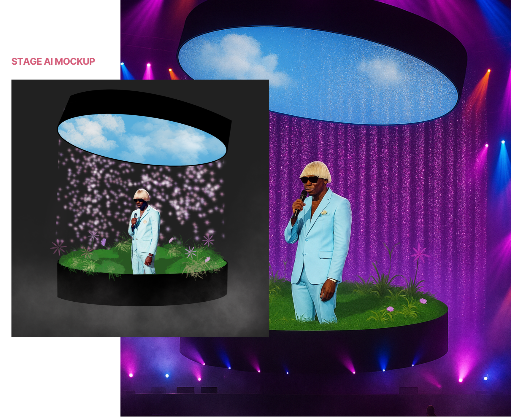 To bring The IGOR Tour to life, we designed and modeled the stage environment using Unreal Engine to simulate lighting, atmosphere, and spatial dynamics in real time. We developed the circular grass-covered platform and suspended ring structure digitally, integrating video mapping to project evolving skies and immersive visuals that responded to each song. Through 3D modeling, lighting programming, and projection design, we built a fully immersive stage concept where technology and scenography worked together to translate the album’s emotional narrative into a live experience.
