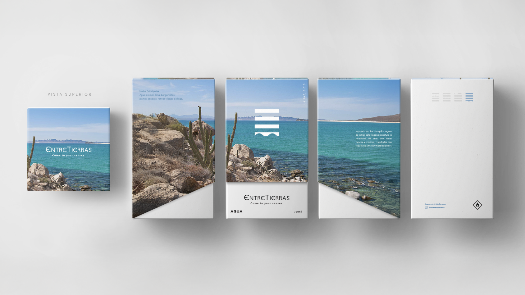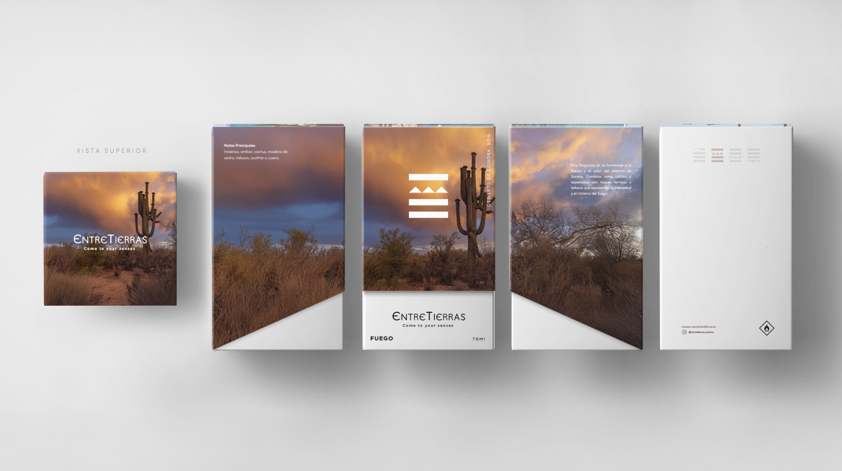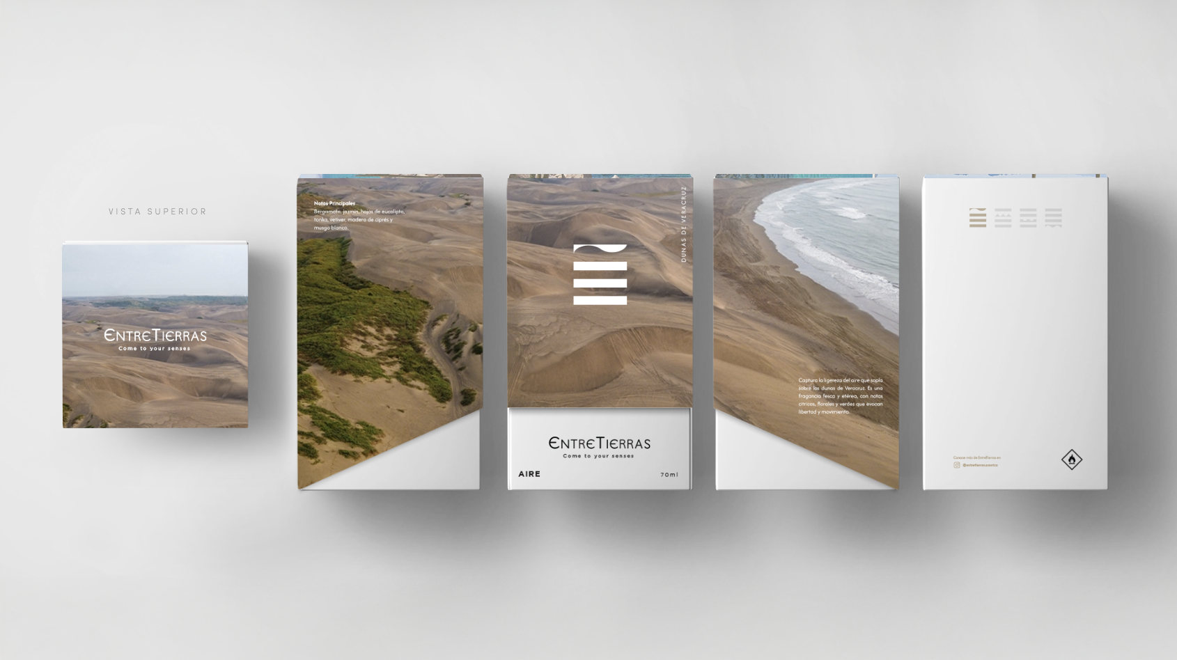 EntreTierras is a fragrance collection inspired by the four natural elements, each expressed through an iconic Mexican landscape. The project consists of four perfumes—Tierra (Tepoztlán), Agua (La Paz), Fuego (Desierto de Sonora), and Aire (Dunas de Veracruz)—each with a distinct olfactory profile, color system, graphic assets, and packaging design that reflect the character of its environment.